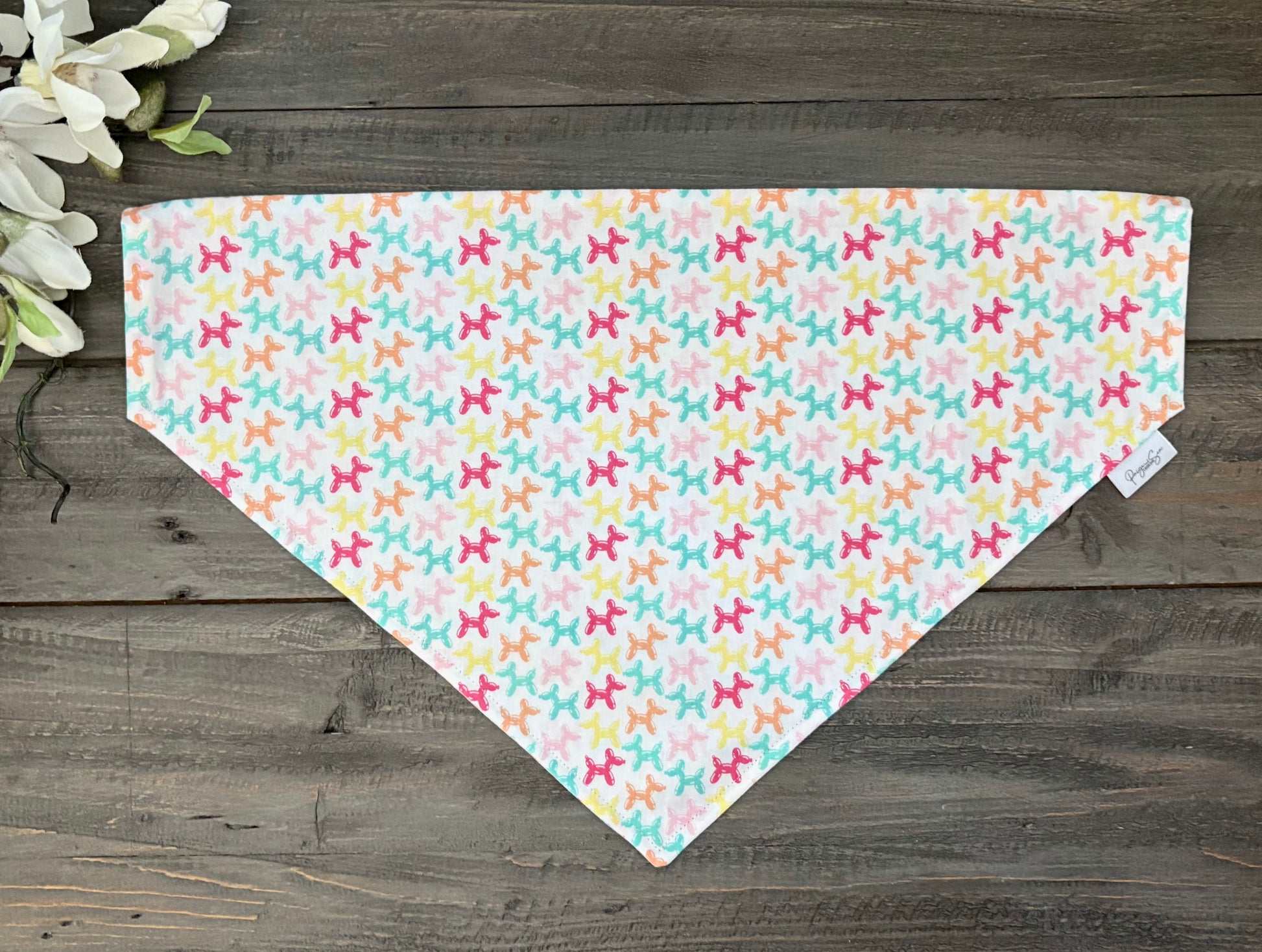 This adorable "animal balloon" over the collar pet bandana has a casual "bunchy" look with a pattern of different coloured animal balloons scattered all over it giving a fun and perfect fashion accessory for your pet!